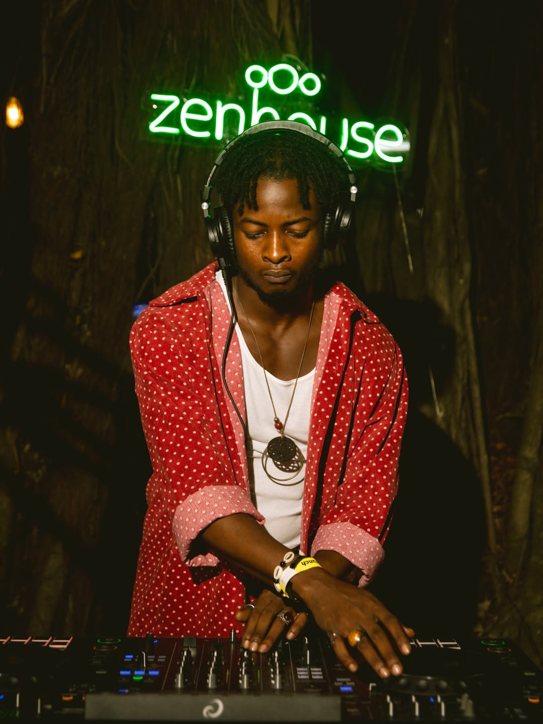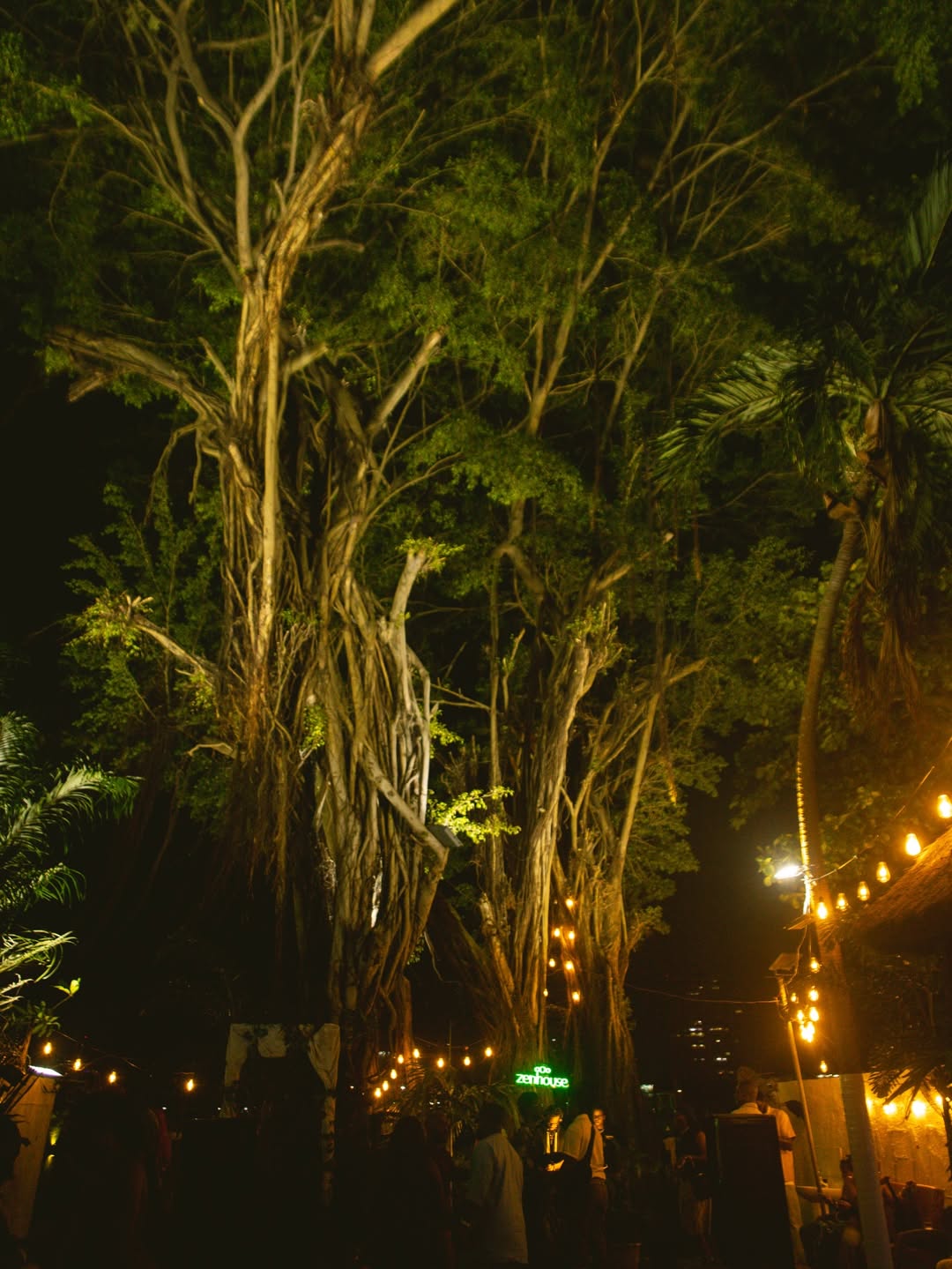 Zenhouse itself already carries a certain atmosphere. Nestled among trees and foliage, the venue feels more like a hidden courtyard than a typical nightlife location. The large fig tree at its center becomes both a natural canopy and the unofficial heart of the gathering.